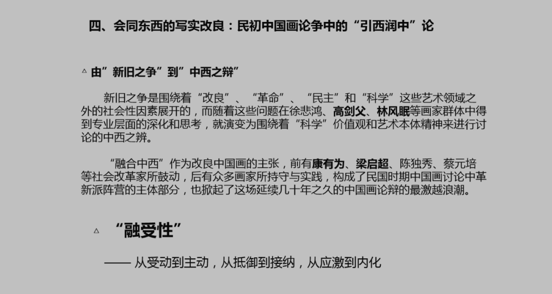 画坛是多元性的,也有地域性的影响。如果说画派是一个历时共地的现象,那么画坛就是一个共时共地的现象,如北京画坛、岭南画坛、当代广东画坛。画坛、画派的问题,如果放大到地域性的南北来看,地域性的画坛研究与画坛的流变有直接的关系。20世纪上半叶“南北画坛的回响”,地域画坛板块之间的响应、互动成为这一时期近现代美术史的非常有特点、有意义、有趣味的问题。生地籍贯、成长环境与地域的集体无意识之间的关系,居所迁徙和地域文化融合的关系,包括画家群体之间的交流,个人的性情、乡情,共同的爱好,画坛以各种人文、地域因素的交融和互动场所来形成表征。激进革新思想,“革命”这个词绝对是20世纪中国文化社会的一个重要的关键词。革命和改良不同,改良是不彻底的,改良是带有保守型和承上启下过渡性的。康有为作为改良论者,对于中国画学思想集中于他的《万木草堂藏画目》序言。他对于中国画改良和变法的根据和源头是“亦当变法”,就是在政治改良、体制改良之后,作为链条一系列的变化,那么画学、艺术也应该如此。作为广东南海人的康有为(康南海)最初提出了这样一个改良变法路向,学习欧洲的油画、写实,但认为实际上这种写实的东西我们是有的,出现了典型的“西学中源”论姿态或者心理,近代史或近代文化史把它叫做“西学中源”论,实际上正是由于文化自信或者文化上面的认同的需求所带来的观念。