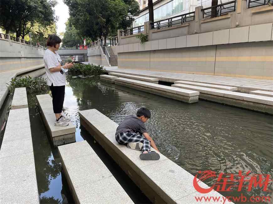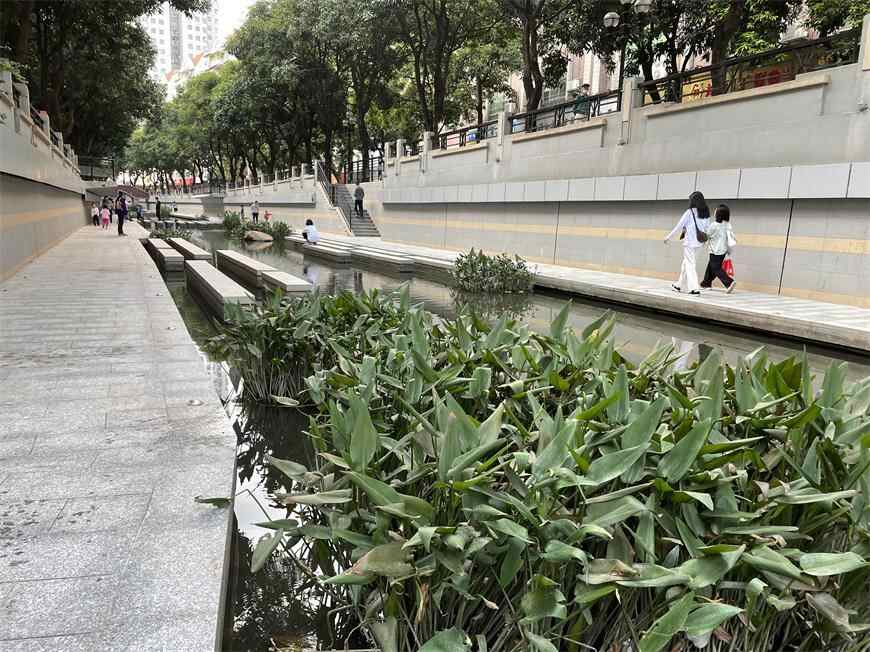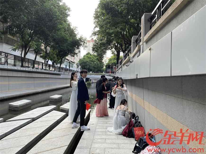 记者新河浦涌旁见到,涌内还新增水生植物,市民在下层平台可以通过临水石阶与河水近距离接触。除了前来打开的市民,记者还遇到一群来自广东技术师范大学的学生,他们身着礼服,在河岸边拍摄。