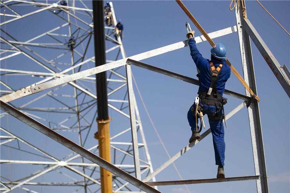 2018年8月7日,在巴西东南部阿科斯市附近,工人在巴西美丽山水电特高压直流送出二期工程项目现场施工。新华社记者 李明 摄