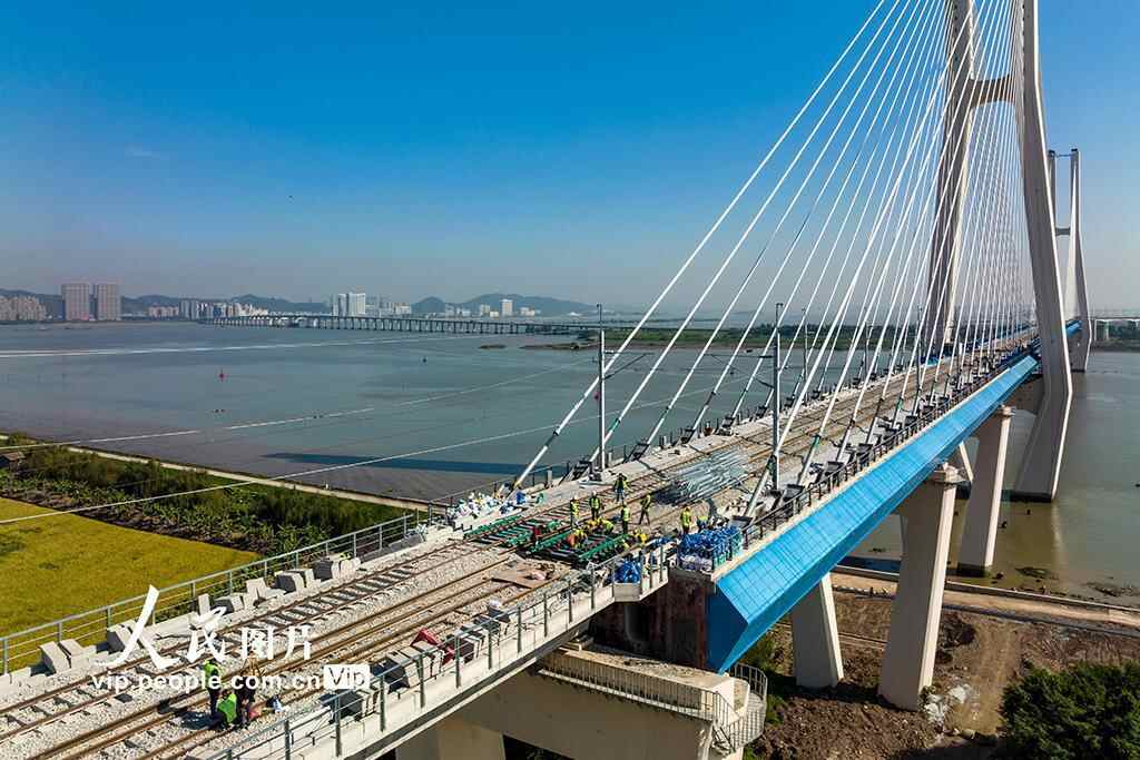11月25日,在广州市南沙区龙穴岛,工人们正在南沙港铁路桥上抓紧施工,为南沙港铁路在年底前通车做最后的冲刺。自10月上旬长轨换铺开工以来,南沙港铁路已铺设长轨135公里,铺轨任务完成超过七成。魏劲松摄