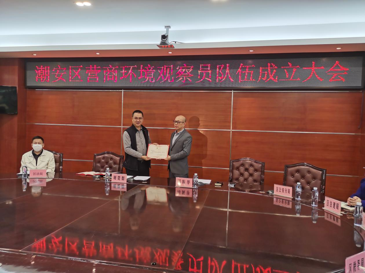 近日,潮州市潮安区举行营商环境观察员队伍成立大会,首批31名营商环境观察员正式走马上任。区委常委、常务副区长谢楚群为观察员颁发聘书。