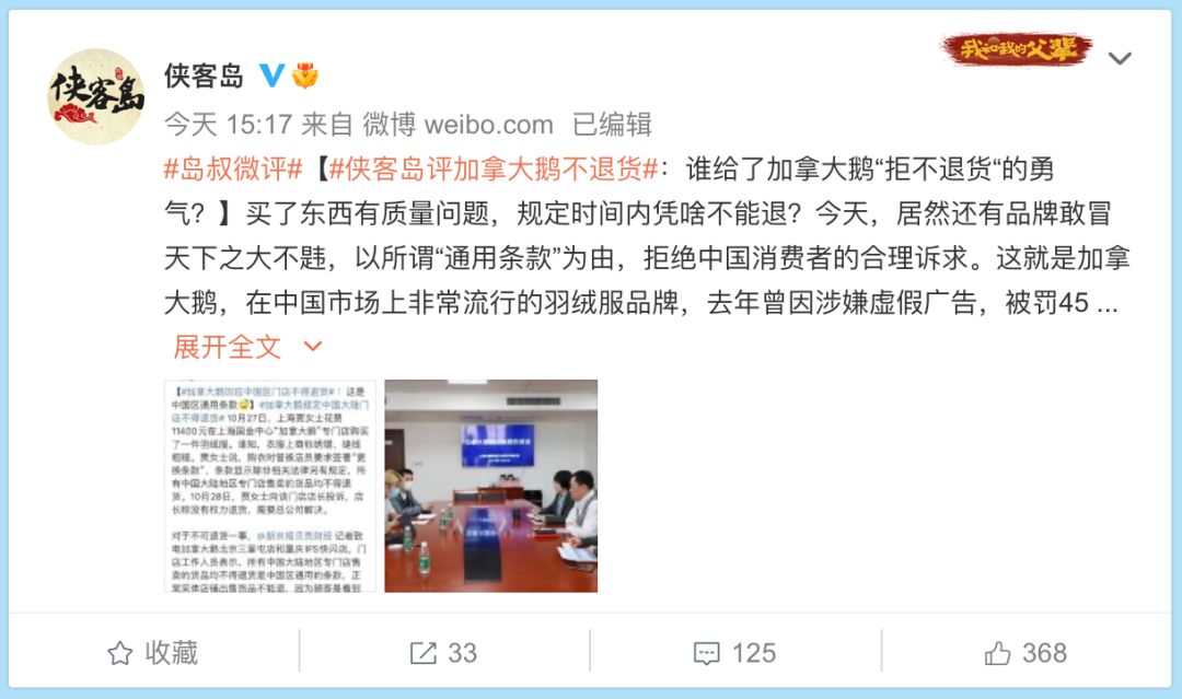 “加拿大鹅中国大陆门店不得退货”?没门!全额退款