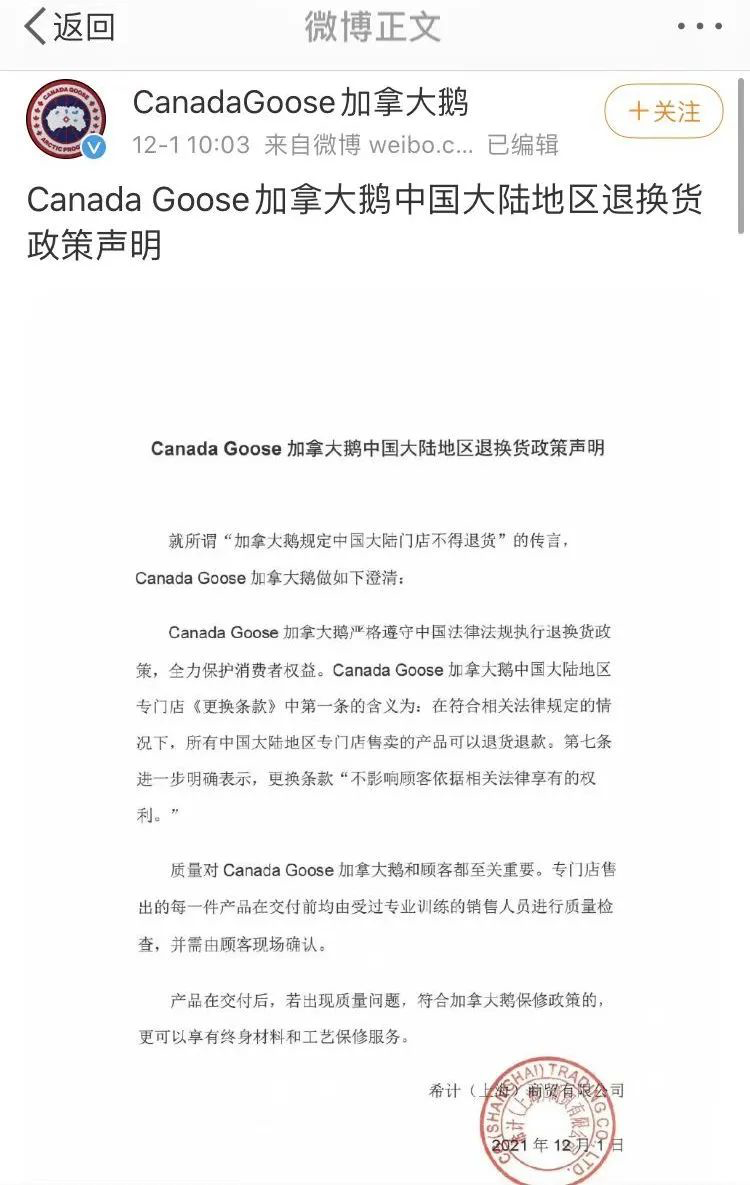 据悉,在约谈会前,加拿大鹅发布声明称在符合相关法律规定的情况下,所有中国大陆地区专门店售卖的产品可以退货退款。