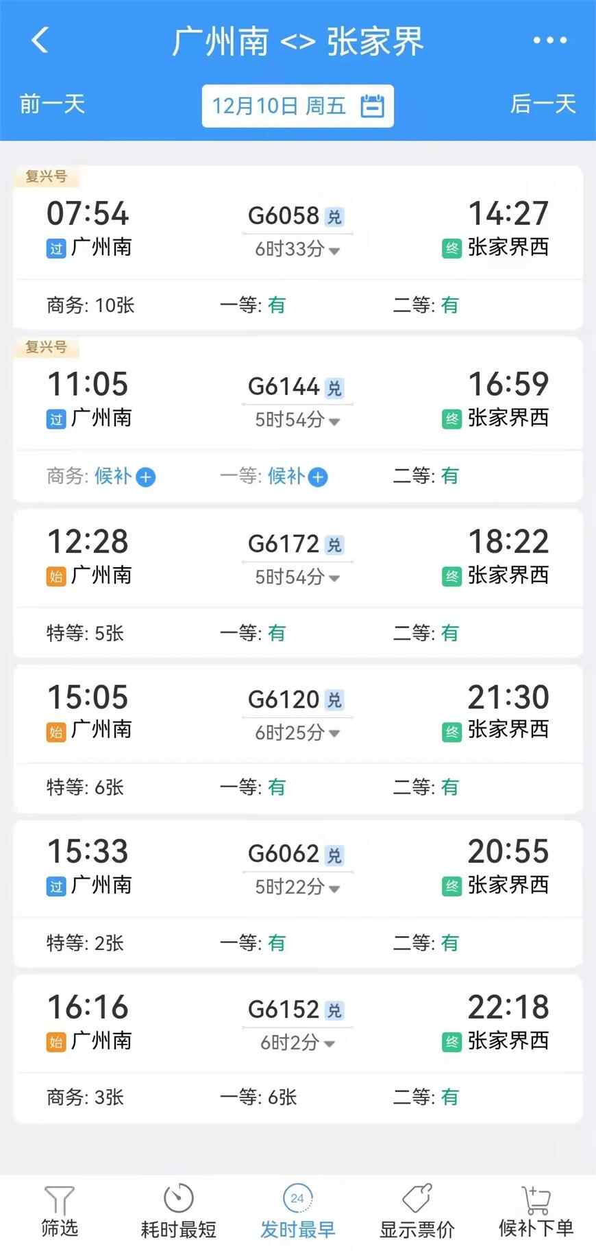 另外,大湾区居民也可在广州南站、深圳北站乘高铁直达张家界西站。记者查询12306网站发现,从广州南站出发,最快5小时22分抵达张家界西站,二等座最低票价为493元。