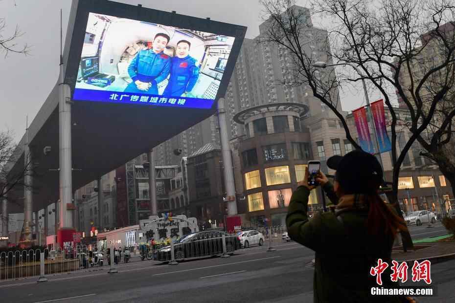 12月9日,北京,市民拍摄“天宫课堂”直播屏幕。当日下午,中国空间站首次太空授课正式开讲。中国航天员翟志刚、王亚平、叶光富在中国空间站为广大青少年带来了一场精彩的太空科普课。 中新社记者 田雨昊 摄