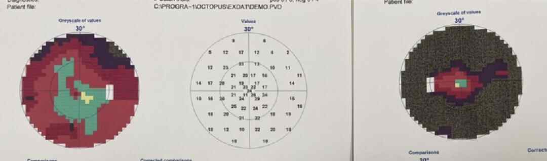 青光眼患者视野图(左图为轻症,右图较严重,绿色为正常视野,其余部分为缺损视野)
