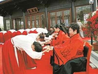仪式现场,在铿锵锣鼓声中,传承班全体弟子面朝东方行三拜之礼。一拜:华夏文明,得蒙先庇;二拜:先圣之道,功过古今;三拜:格物致知,修身治齐。礼毕,弟子们齐声诵读《大医精诚》节选。随后,弟子上台呈拜师帖,并向老师献上六礼。六礼包括:芹菜,寓意业精于勤;肉干,孔子规定的拜师礼;桂圆,寓意功德圆满;红枣,寓意早早高中;红豆,寓意红运高照;莲子,寓意苦心教育。