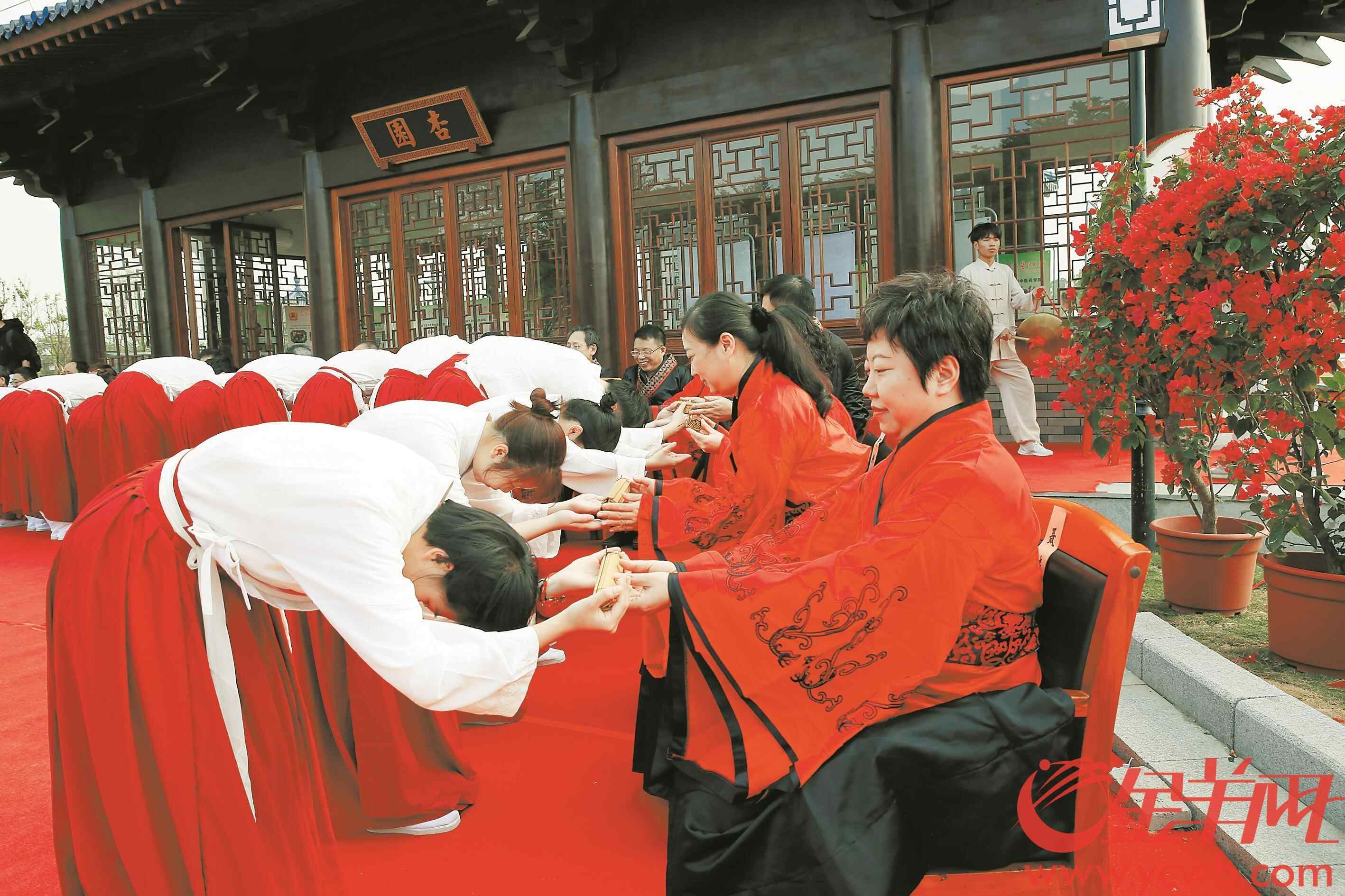 羊城晚报讯 记者陈亮,通讯员蒋雨楠、周子云、黄瑶摄影报道:身着古装,呈拜师帖,呈六礼束脩,呈敬师礼茶……17日,南方医科大学“名老中医传承班”拜师仪式在该校顺德校区中医药文化基地(杏园)举行(见上图)。中医药学院2020级中医学(名老中医传承班)的30名学子正式拜入名老中医导师门下,开启更深层次的杏林生涯。