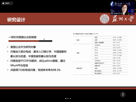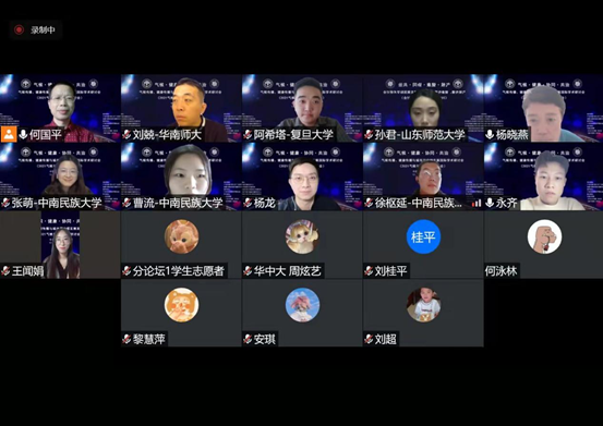 分论坛上,专家学者与研究生汇聚云端,围绕各自分论坛主题展开热烈的讨论。复旦大学新闻学院博士后阿希塔讲师、中国地质大学(武汉)艺术与传媒学院李静特任副教授、苏州大学传媒学院潘野蘅讲师、黄淮学院文化传媒学院刘文琦讲师、中央财经大学绿色金融国际研究院任国征研究员分别作了《植绿还是漂绿?企业环保的认知、表征与动员——基于中国创新创业大赛沙产业大赛的传播民族志考察》《气候变化与雾霾如何在媒体报道中关联:议题互动与风险重构》《中国国家气候形象的现状与问题——基于美国调查数据的实证分析》《数字化时代城市书房发展研究》《健康环境视野下的清洁生产模式与建议》等主题分享,各高校的研究生同样带来了自己对议题的思考,多学科的思想在此碰撞与交汇。