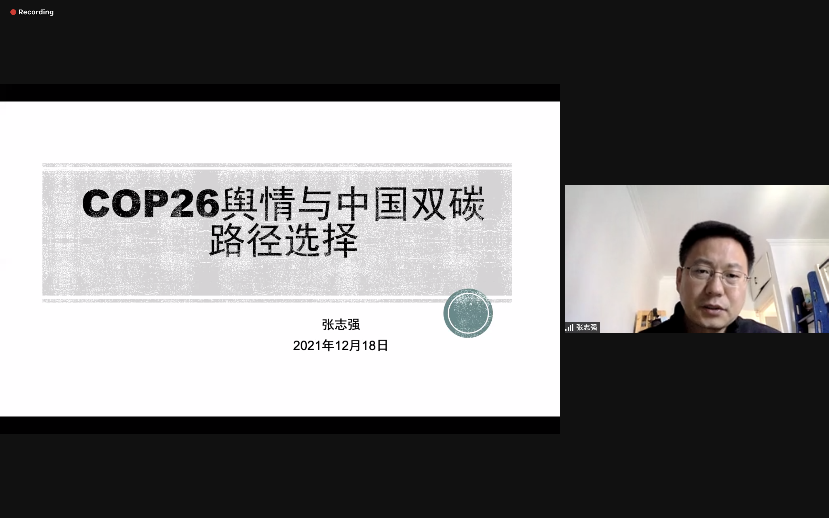 接下来国家应对气候变化战略研究和国际合作中心对外合作交流部主任、中国气候传播项目中心张志强执行主任为我们带来了以“COP26舆情环境与中国双碳路径选择”为主题的分享。张主任聚焦了“双碳目标”、“一带一路”、“世界领导人峰会”、“煤电”、“核电”等16个议题进行了中外正负舆情的分析,并指出当前国外媒体在COP26相关话题上的发言活跃,而中国媒体议程设置能力则稍显不足。然后张主任展示了“全球煤炭储量分布与消费”、当前中国碳排放现状等相关数据图表,强调了我国关于碳达峰、碳中和的相关工作意见、政策与指示。最后提出了“存量”、“增量”、“国内”、“国际”四个维度的思考。