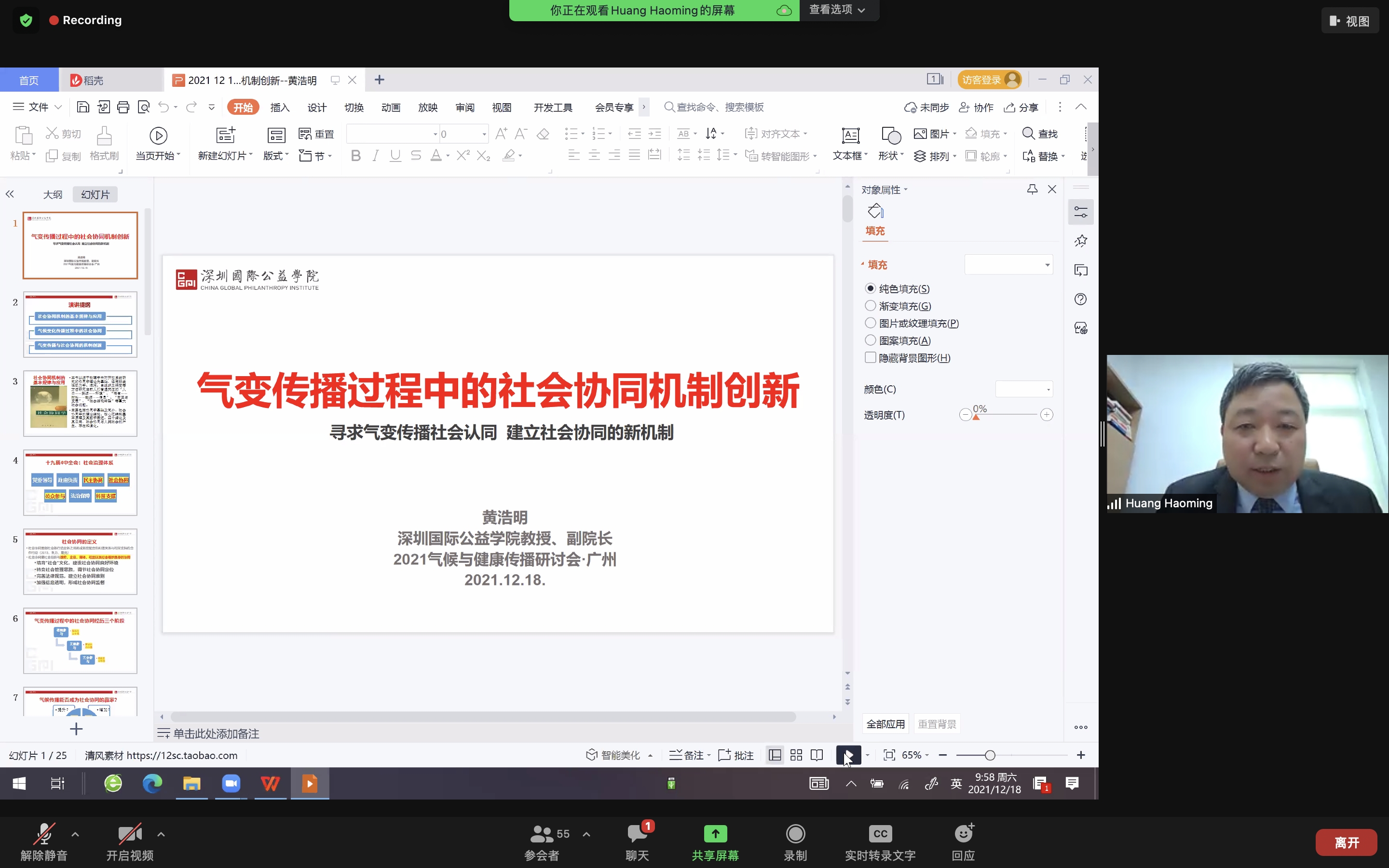 开幕式由广东外语外贸大学新闻与传播学院院长、广州城市舆情治理与国际形象传播研究中心主任侯迎忠教授主持。侯院长对各位境内外专家学者齐聚云端,共同研讨气候变化、健康传播与城市可持续发展的相关问题表示热烈欢迎。