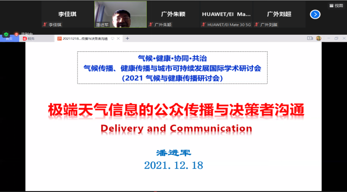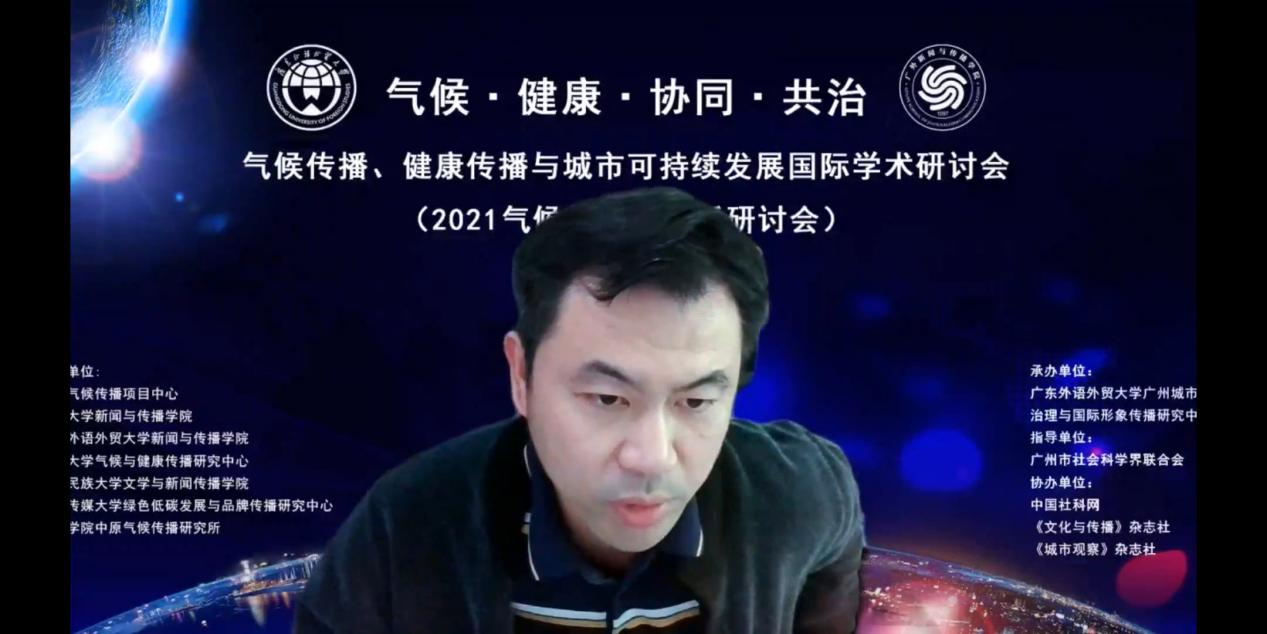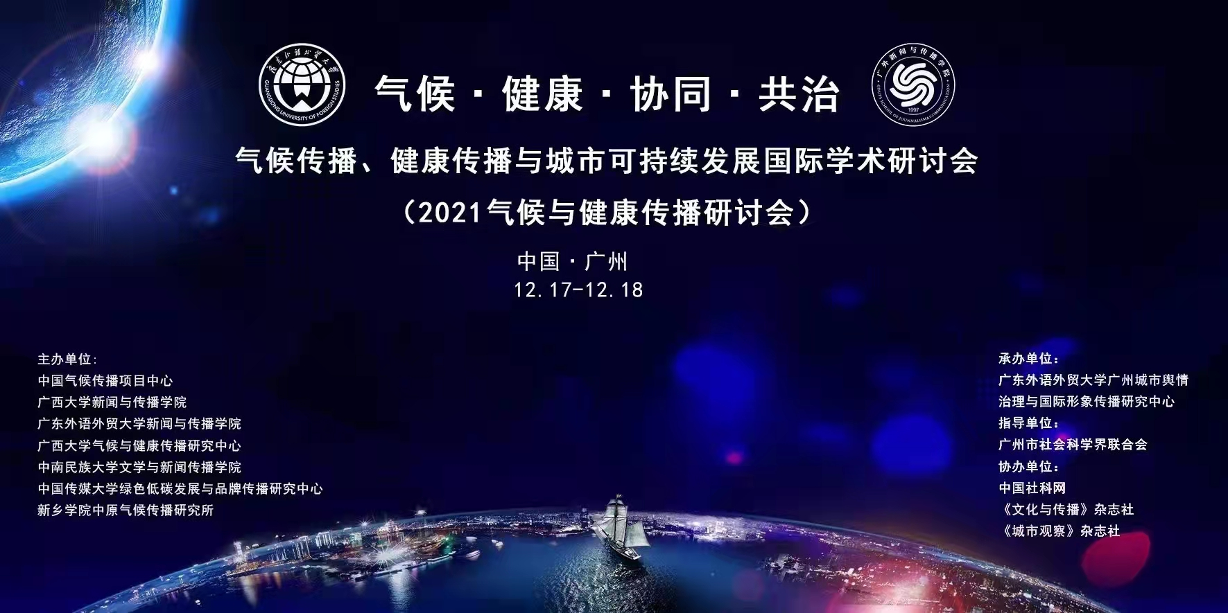 12月17-18日,第十二届广州学术季活动暨“气候传播、健康传播与城市可持续发展”国际学术研讨会(2021气候与健康研讨会)在广东外语外贸大学成功举办。本次论坛系由广州市社会科学界联合会指导,中国气候传播项目中心、广西大学新闻与传播学院、广东外语外贸大学新闻与传播学院、广西大学气候与健康传播研究中心、中南民族大学文学与新闻传播学院、中国传媒大学绿色低碳发展与品牌传播研究中心和新乡学院中原气候传播研究所主办,广东外语外贸大学广州城市舆情治理与国际形象传播研究中心承办,中国社科网、《文化与传播》杂志社和《城市观察》杂志社协办。会议分为主论坛和五个主题分论坛,均通过线上举行。