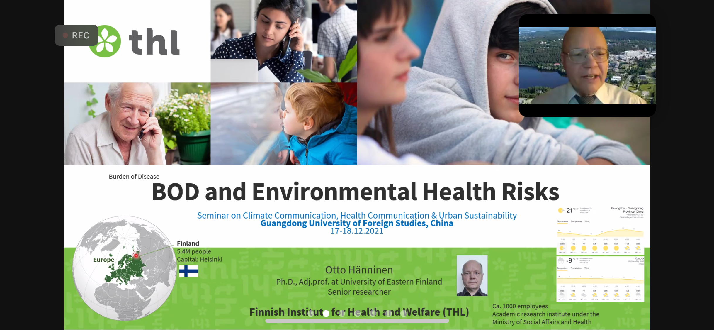 最后,芬兰健康与福利研究院环境健康研究所Otto Hänninen教授围绕《欧洲环境健康风险治理与实践》展开分享。Otto教授用兰塞特污染与健康委员会的一篇报告中一系列图表比较全球疾病负担研究与WHO数据。Otto教授结合不同疾病造成的过早死亡和发病的健康损失,认为残疾调整寿命等于残疾生活年限加上损失的生命年数。他还用具体数据分析了污染风险因子导致的死亡数与死亡年龄,发现年龄越大越容易被污染风险因子致死。一项关于芬兰空气污染的健康风险调查结果显示,高危害程度污染风险因子主要有环境颗粒物,室内氡气,室内颗粒物,噪音,紫外线辐射等,在空气污染物中,占主导地位的是环境颗粒物、室内氡气与颗粒物。最后他提出疾病负担研究遇到的挑战:对于国际研究来说缺乏国内数据,大多数的疾病负担都未知的其因。