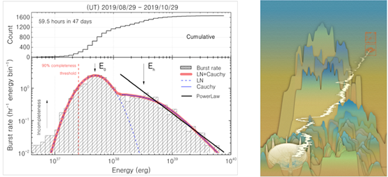 快速射电暴(FRB)是宇宙中最明亮射电爆发现象,起源未知,是天文学最新热点。国家天文台领导的国际合作团队利用FAST对快速射电暴FRB121102进行观测,在约50天内探测到1652次爆发事件,获得迄今最大的快速射电暴爆发事件样本,超过此前本领域所有文章发表的爆发事件总量,首次揭示了快速射电暴的完整能谱及其双峰结构。