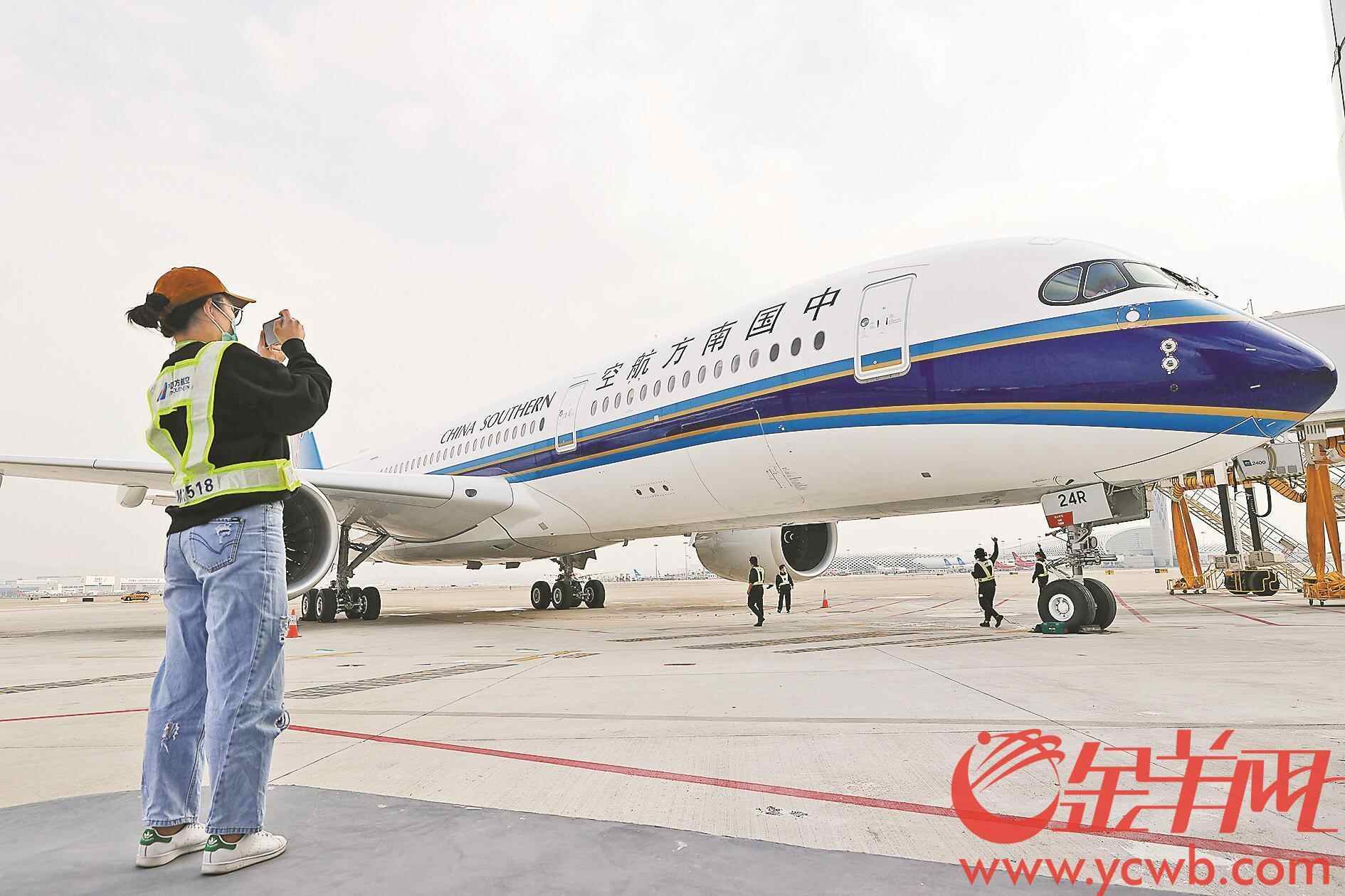 羊城晚报讯 记者李天军、王磊摄影报道:广东深圳迎来了目前最大的空客宽体客机。6日,南航2架全新大型远程宽体A350-900型客机同时落户深圳,加盟南航深圳分公司。此次引进的A350-900飞机,因独特的驾驶舱玻璃设计,被亲切地称之为“墨镜侠”。