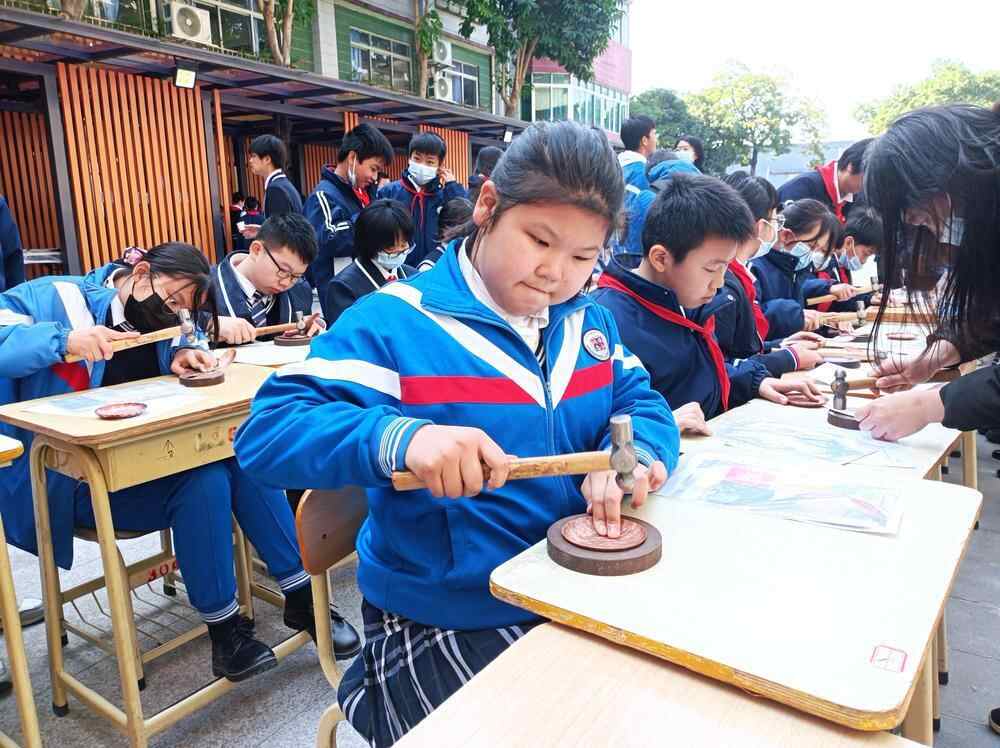颁奖仪式结束后,该校十余个社团在校内进行展示。学生们排起长龙品茶、品味西关美食等社团活动。在西关打铜制作区,广东省级非物质文化遗产西关打铜传承人苏英敏正指导同学们用锤子敲打铜质碟与小勺。有节奏的锤击声不绝于耳,同学们都专心致志地用锤子打磨铜制品。虽然今天是苏英敏首次带着打铜工艺进入该校,但同学们都兴致高涨,积极排队体验。该校美术社教师郑婉华表示,后续会考虑将打铜工艺引入,成为学校社团活动。