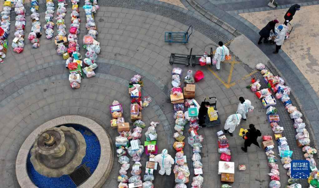 1月12日,下沉干部和志愿者在社区门前小广场准备配送居民线上购买的生活物资(无人机照片)。