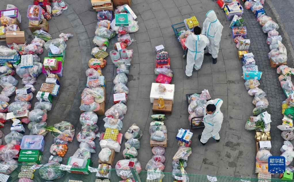 1月12日,下沉干部和志愿者在社区门前小广场接收居民线上购买的生活物资(无人机照片)。