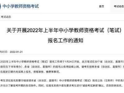 按照教育部考试中心的消息,2022年上半年中小学教师资格考试(笔试)报名开始时间为1月24日,此次笔试在30个省(自治区、直辖市)举办(西藏目前仅在下半年举办)。