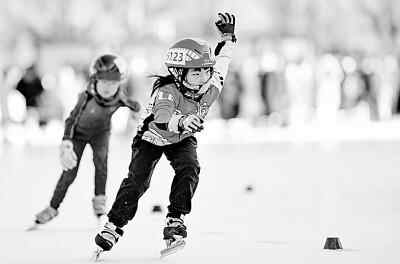2022呼和浩特青少年体育俱乐部滑冰联赛开赛,选手在速度滑冰比赛中。新华社发