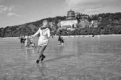 67岁花滑冠军曲薇在颐和园冰场上滑冰。新华社发