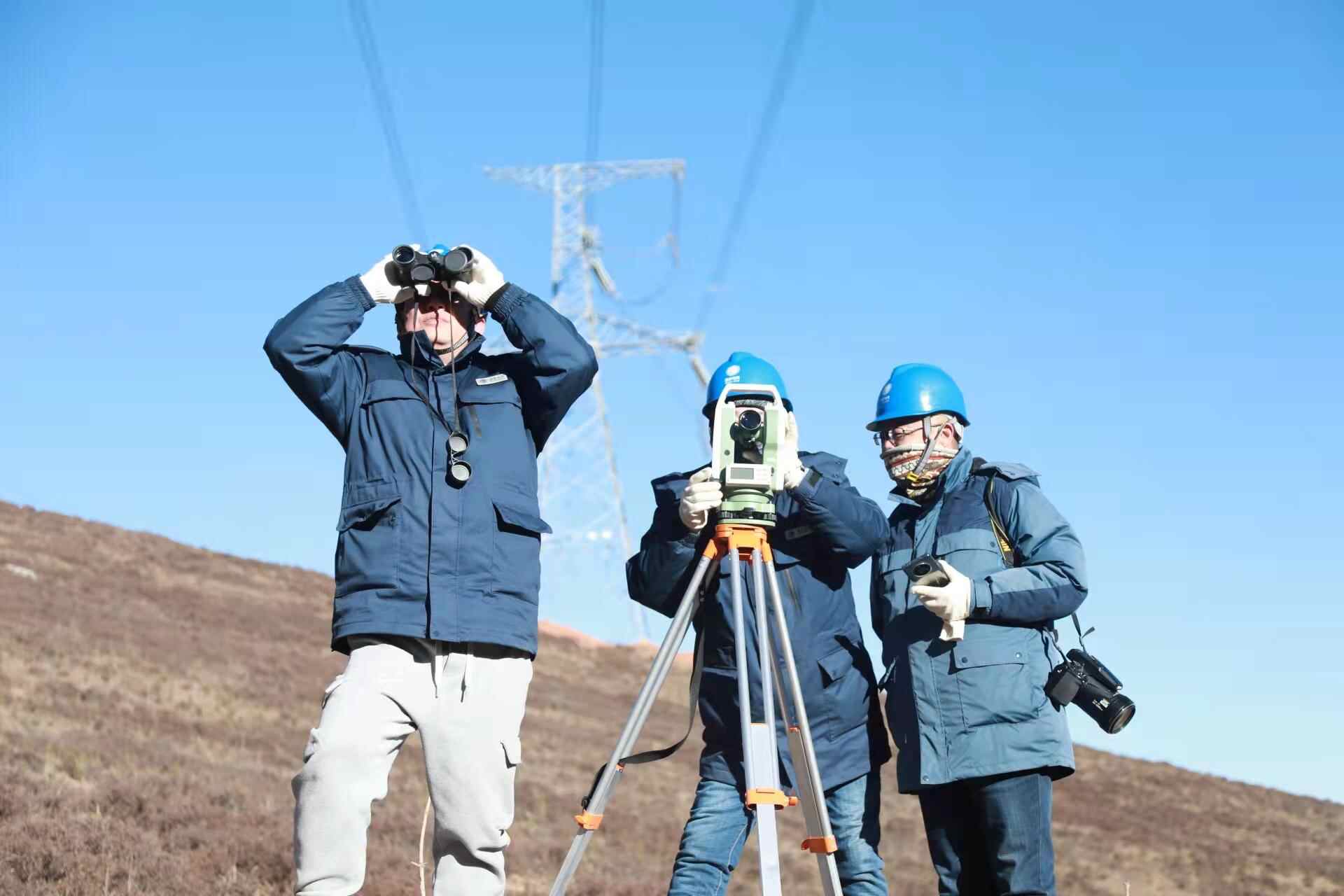 1月25日,国网青海检修公司输电运检人员对750千伏拉宁线开展春节前特巡,使用经纬仪测量铁塔角度。朱毅然 摄