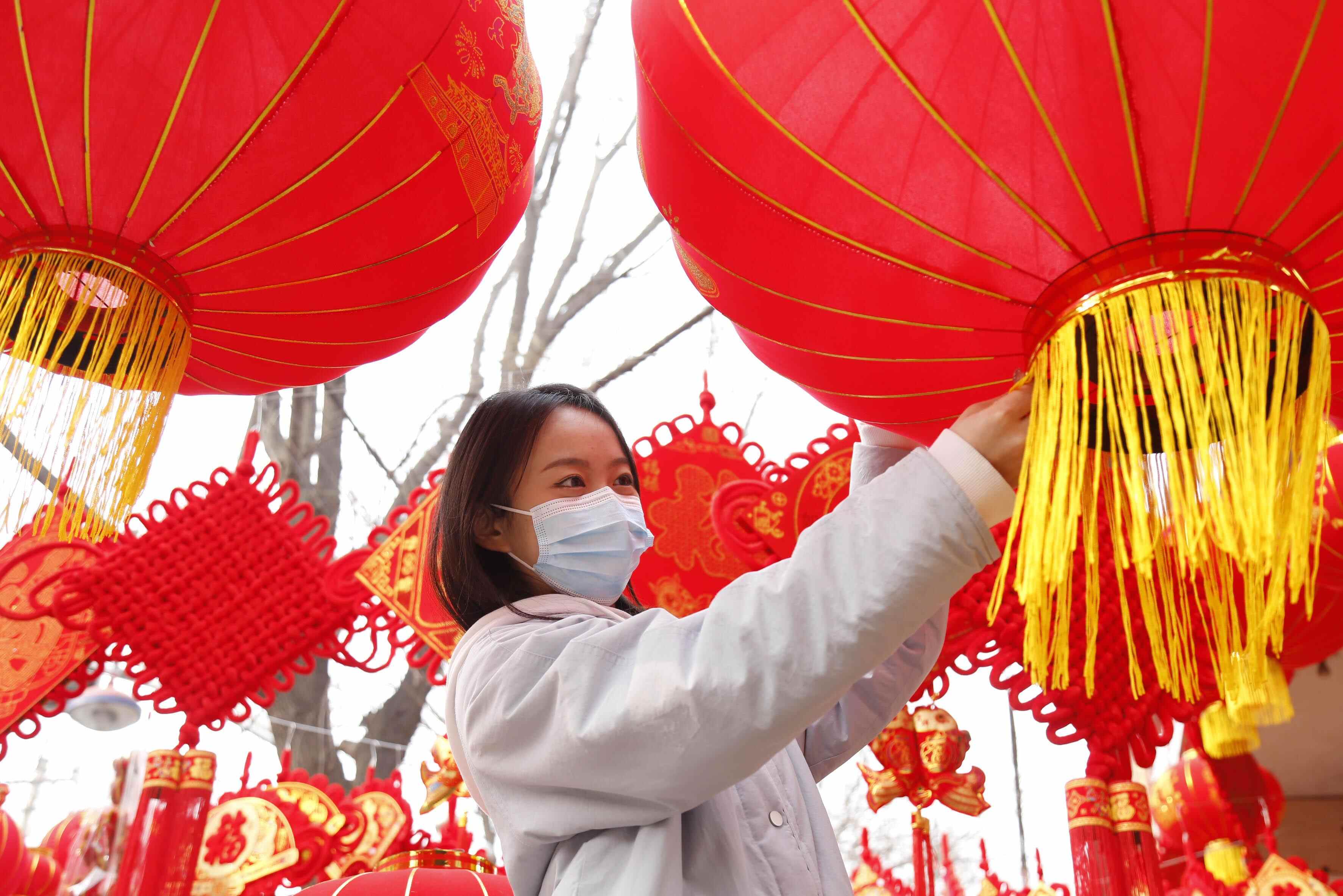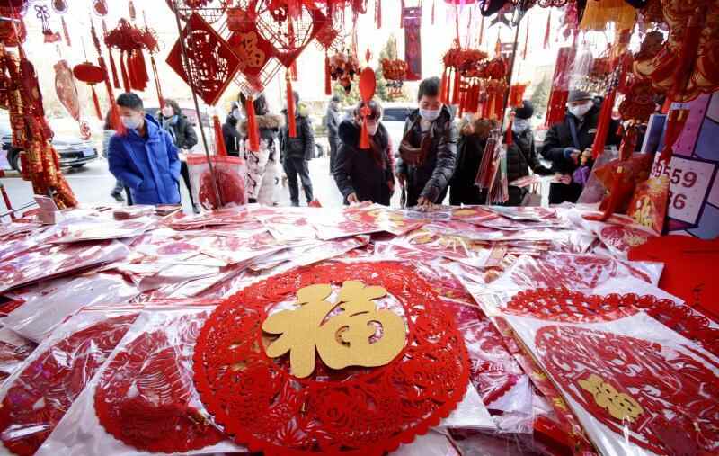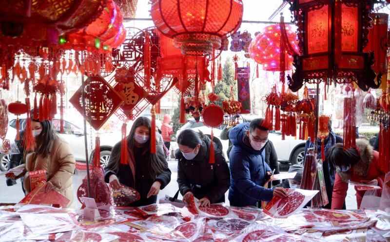 1月29日,顾客在河北省邢台市南和区和阳镇集市购买节庆饰品。春节临近,各地居民选购春联、福字、灯笼等节庆饰品,并组织各类文化活动,红红火火迎接新春佳节。新华社发(张驰摄)