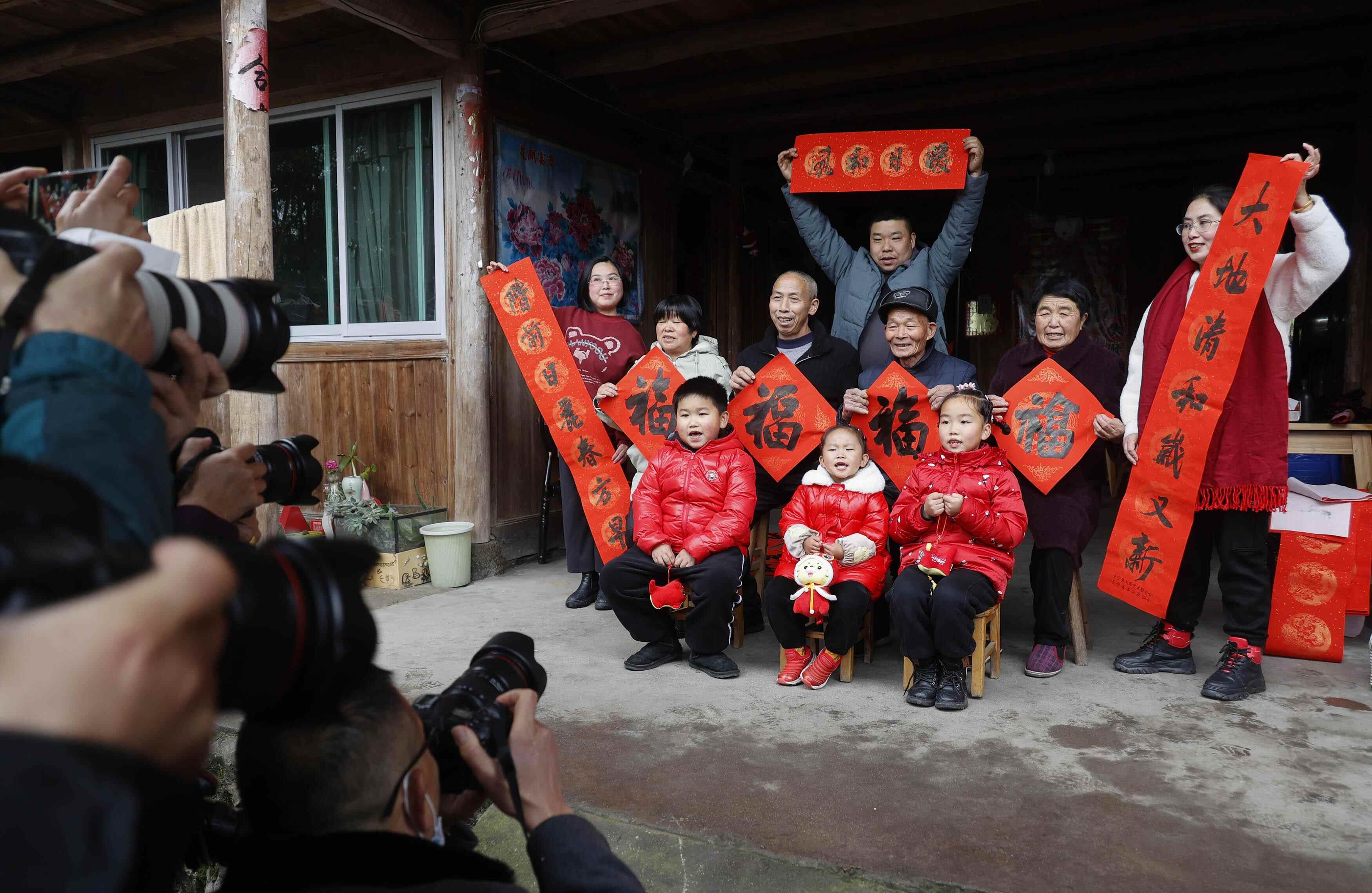 1月29日,摄影师在浙江省景宁畲族自治县红星街道山后村为村民拍摄“全家福”。春节临近,各地居民选购春联、福字、灯笼等节庆饰品,并组织各类文化活动,红红火火迎接新春佳节。新华社发(李肃人摄)
