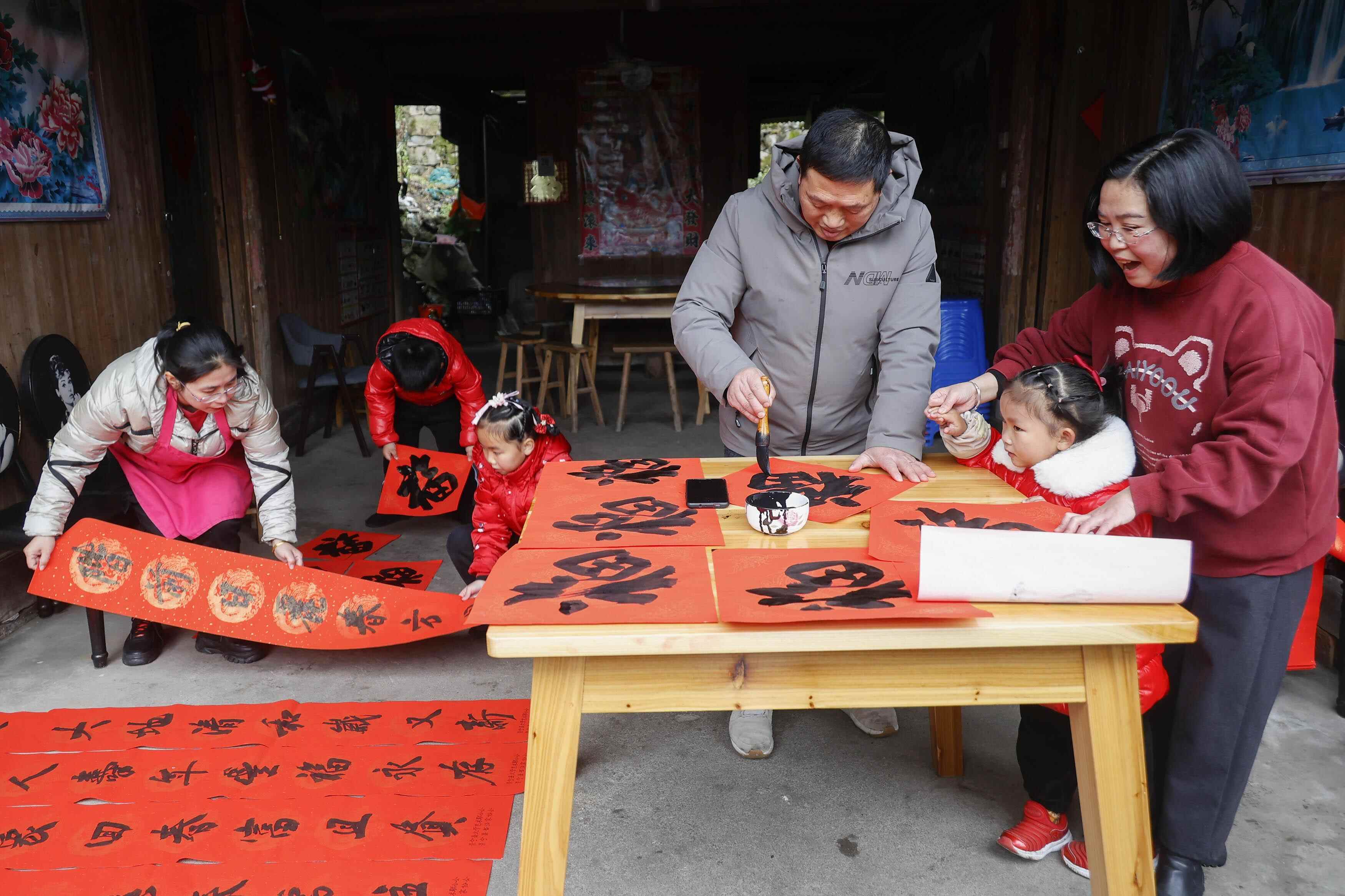 1月29日,书法家在浙江省景宁畲族自治县红星街道山后村为村民写福字和春联。春节临近,各地居民选购春联、福字、灯笼等节庆饰品,并组织各类文化活动,红红火火迎接新春佳节。新华社发(李肃人摄)