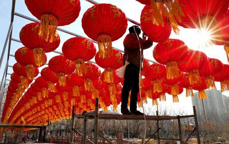 1月29日,在江苏省连云港市海州区苍梧绿园东出入口,工作人员在给灯笼长廊安装灯带。春节临近,各地居民选购春联、福字、灯笼等节庆饰品,并组织各类文化活动,红红火火迎接新春佳节。新华社发(耿玉和 摄)