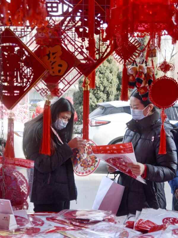 1月29日,顾客在河北省邢台市南和区和阳镇集市购买节庆饰品。春节临近,各地居民选购春联、福字、灯笼等节庆饰品,并组织各类文化活动,红红火火迎接新春佳节。新华社发(张驰 摄)