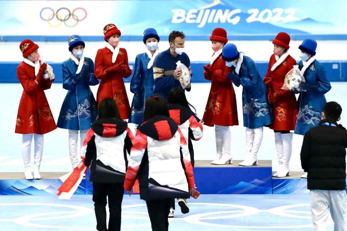 1月30日,拍摄在国家速滑馆“冰丝带”进行颁奖仪式演练。 中国日报记者 张威 摄