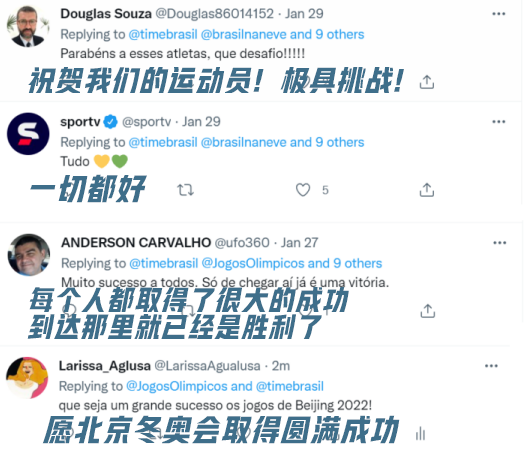 巴西多位冬奥运动员亦发帖记录北京冬奥村见闻,表示将珍惜在华美妙经历,在北京冬奥赛场上超越自我、挑战极限。