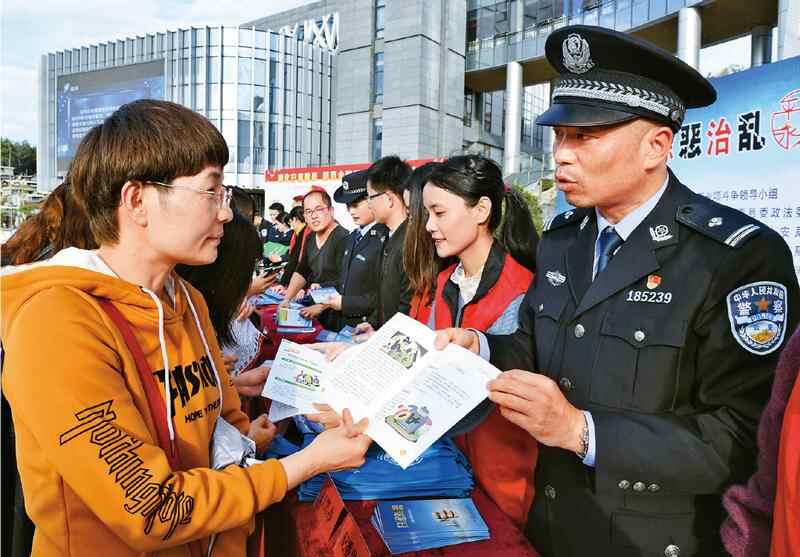 巩固深化扫黑除恶专项斗争、政法队伍教育整顿成果,让群众从一个个具体问题的解决中切实感受到公平正义。图为2020年1月6日,福建省福州市永泰县公安干警在扫黑除恶专项斗争宣传活动上向群众介绍专项斗争成果。 新华社记者 张国俊/摄