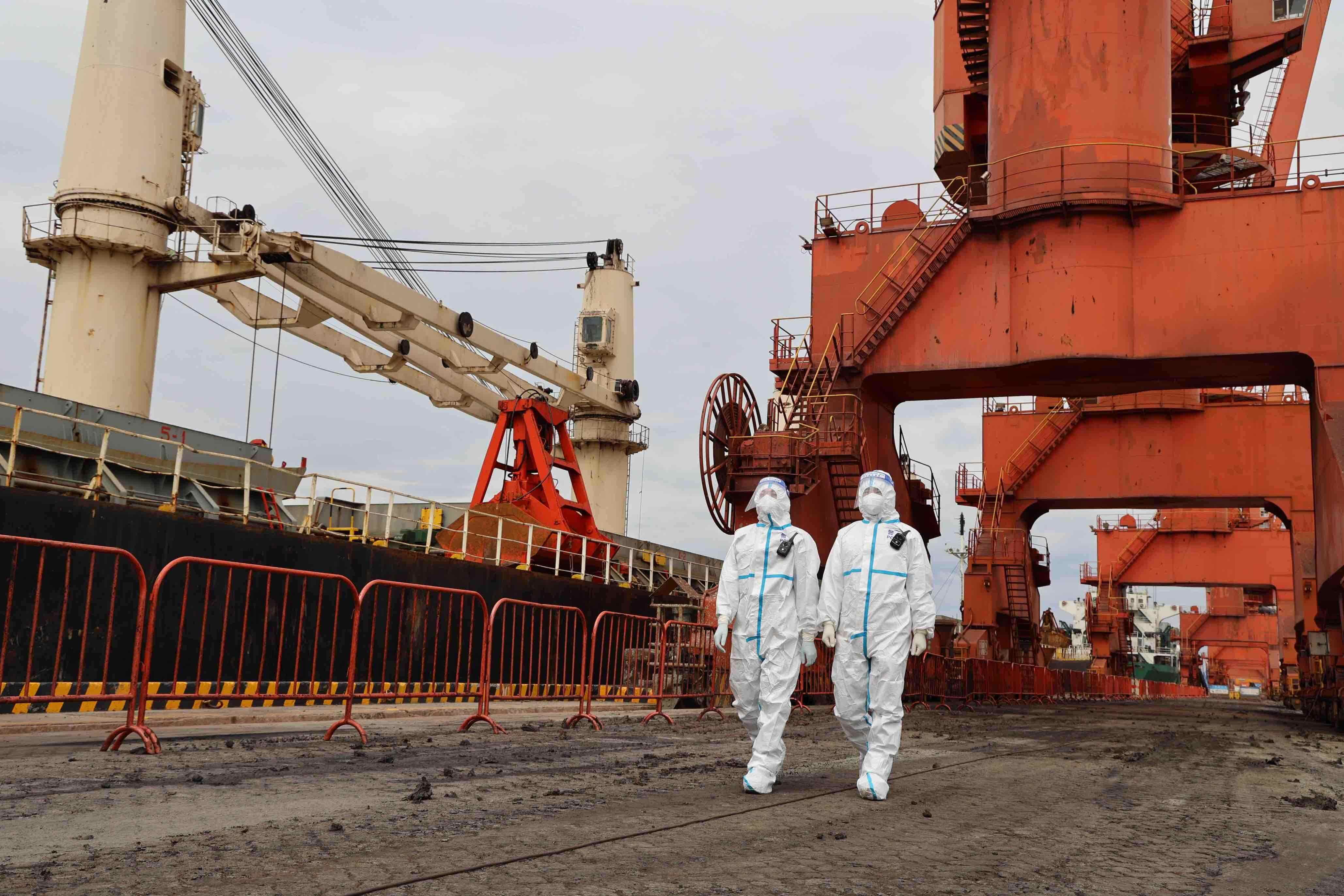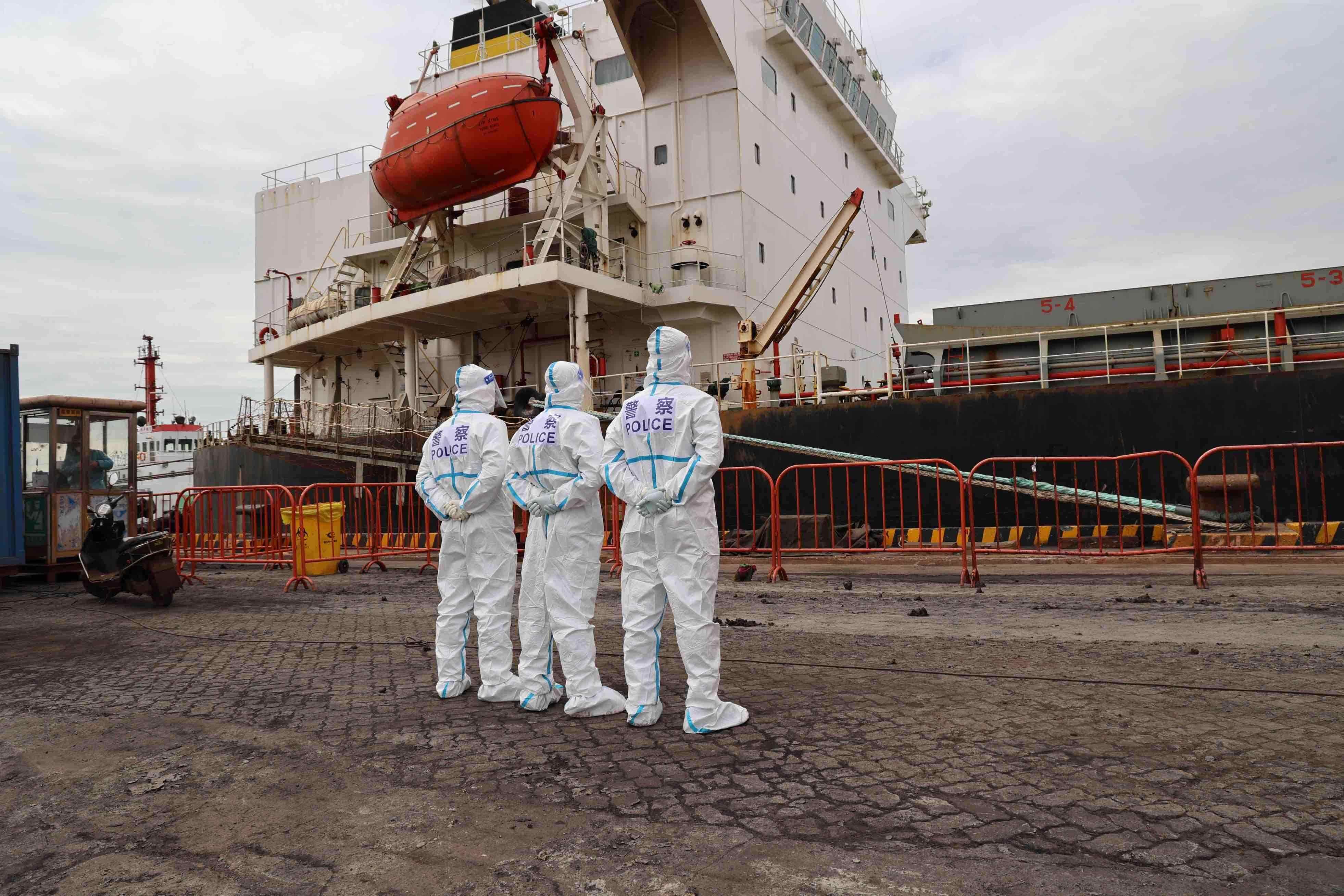 2月2日,大年初二,满载镍铁的巴拿马籍“长运”轮货轮驶进了阳江港,接到船舶代理预报后,执勤民警立即对船舶相关信息进行核查。同时,执勤民警穿好防护服,戴上口罩、手套、护目镜、面屏等防护装备,严格按照防疫要求做好防护工作,对入境船舶开展了检查。