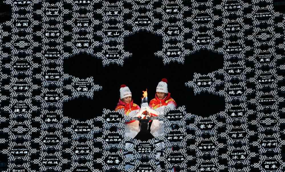 2月4日晚,第二十四届冬季奥林匹克运动会开幕式在北京国家体育场举行。这是最后一棒火炬手迪妮格尔·衣拉木江(左)和赵嘉文将火炬嵌入“大雪花”中央。新华社记者李尕摄