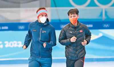 1月29日,国家速滑馆,中国速度滑冰队队员宁忠岩(右)与挪威选手一同热身。
