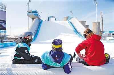 2月6日,首钢滑雪大跳台,3名选手在完成自由式滑雪大跳台训练后一起休息。