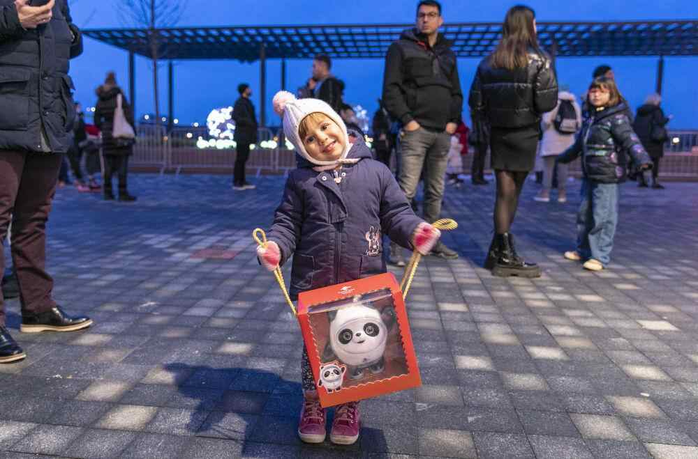 1月31日,在塞尔维亚贝尔格莱德举行的中国灯展上,一名儿童拿着北京冬奥会吉祥物“冰墩墩”。新华社发(王韡摄)