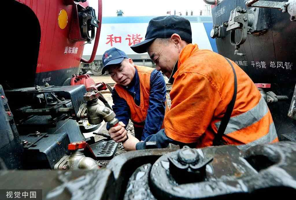 2022年2月7日,江西鹰潭,中国铁路南昌局集团公司鹰潭机务段整备车间交车工长聂华平(左)与工友一起更换机车风管。