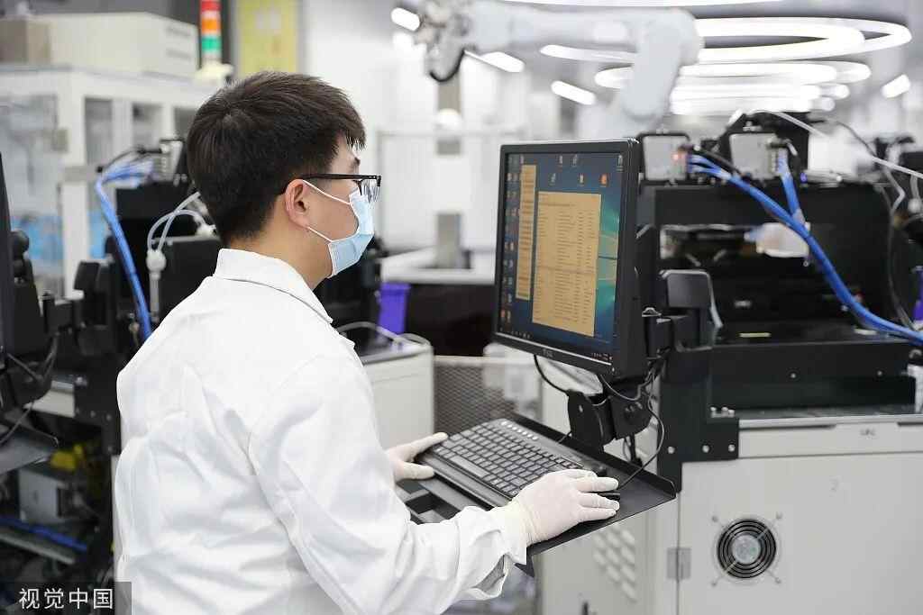 2022年2月7日,合肥,肥东县合肥循环经济示范园内的某生产车间,工人在光伏电池片丝网印刷机前忙碌。