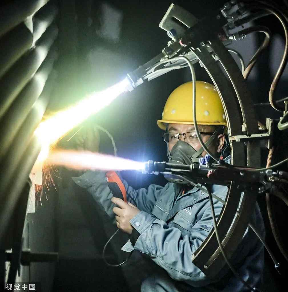 2022年2月7日,江苏淮安,工人加工生物质焚烧电站设备作业。