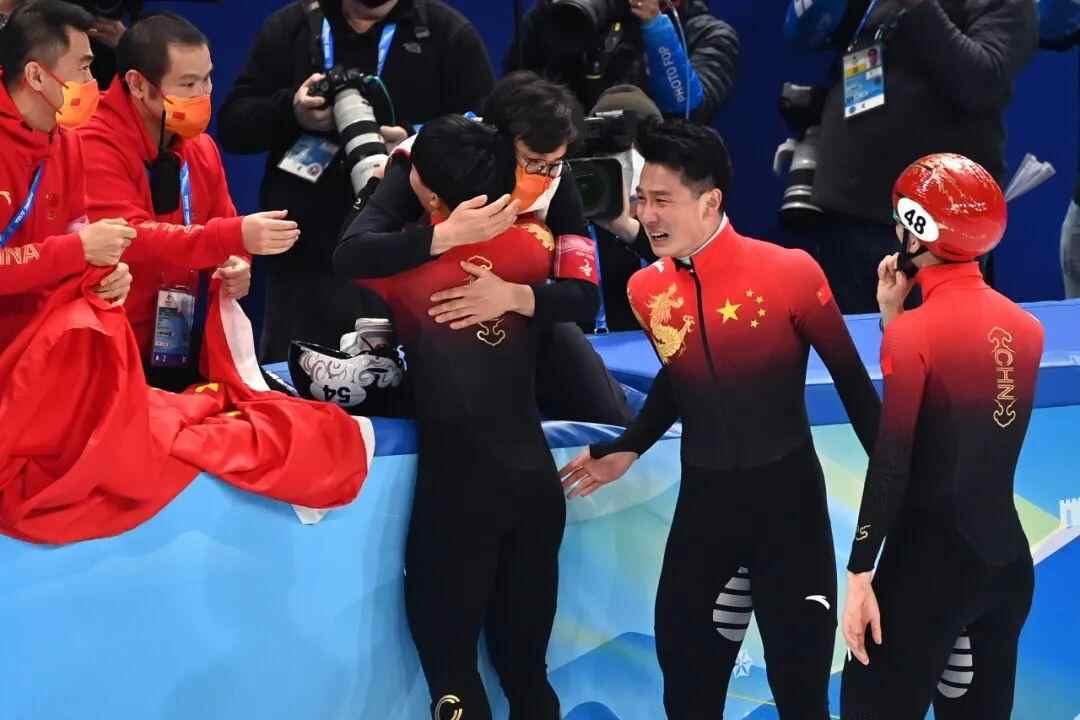 2月7日,任子威(右二)在比赛后庆祝。当日,在首都体育馆举行的北京2022年冬奥会短道速滑项目男子1000米决赛中,中国选手任子威夺得冠军。新华社记者 黄宗治 摄
