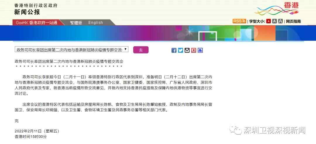 2月11日15时,香港特别行政区政府发布新闻公报,香港特区政府政务司司长李家超2月11日率领香港特别行政区代表到深圳,准备出席2月12日第二次内地与香港新冠肺炎疫情专题交流会,与国务院港澳事务办公室、国家卫健委、国家疾控局、广东省人民政府、深圳市人民政府代表及专家,