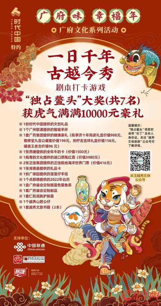 线下与之相对应的则是市民群众心心念念的幸福邮局集戳通关活动。这一活动与“一日千年·古越今秀”剧本打卡游戏同步开展。嵌有两枚虎年生肖邮票的游戏通关文牒可在广大路邮局(越秀区广大路37号)购买(限量400套),集齐所有邮戳的朋友可到越秀区文化馆(东湖路39号)领取神秘礼品。