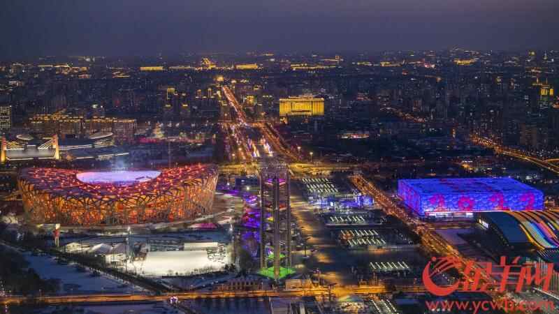 从北京奥林匹克塔上向下眺望,“鸟巢”“冰立方”“冰丝带”等冬奥会场馆美轮美奂,流光溢彩 羊城晚报特派记者 梁喻 林桂炎 摄