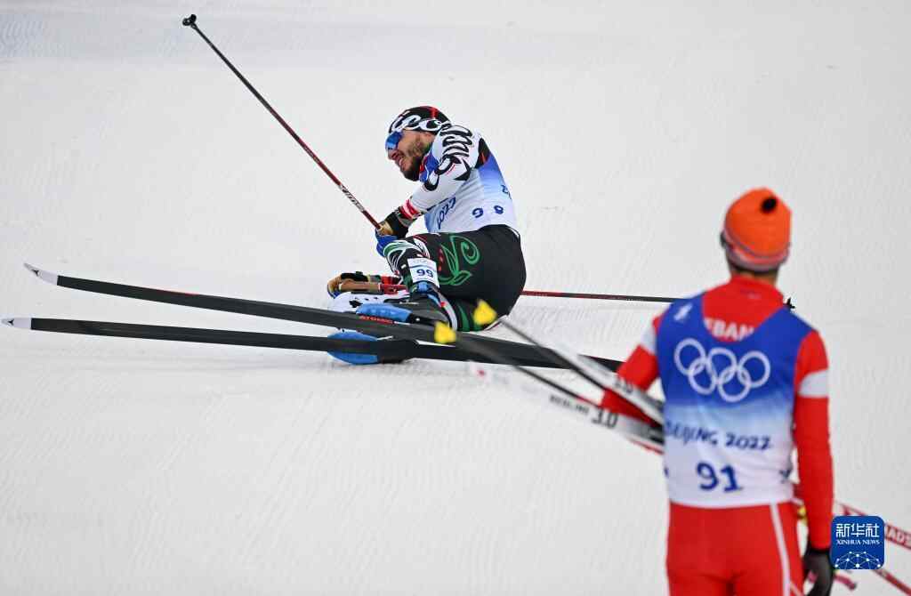 墨西哥运动员乔纳森·索托·莫雷诺在北京冬奥会越野滑雪男子15公里(传统技术)的比赛中冲过终点后(2月11日摄)。