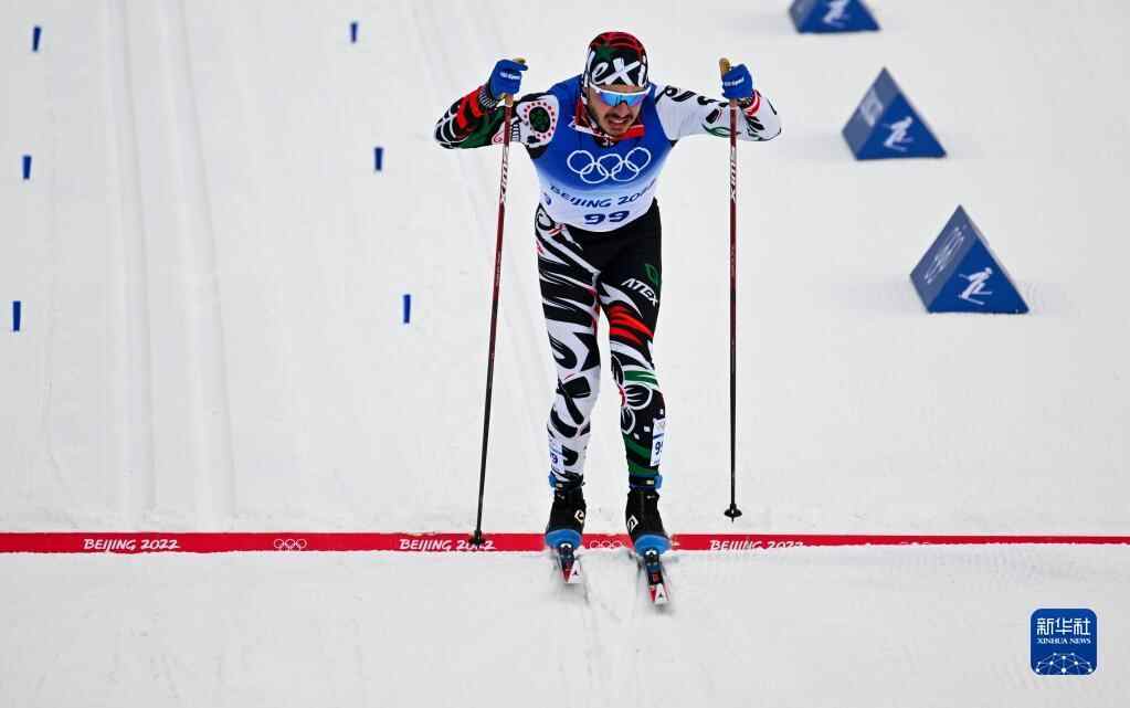 墨西哥运动员乔纳森·索托·莫雷诺在北京冬奥会越野滑雪男子15公里(传统技术)的比赛中冲过终点(2月11日摄)。