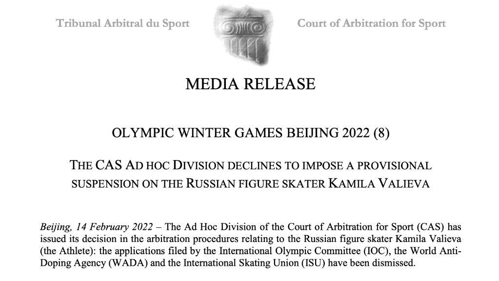 国际体育仲裁法庭14日驳回国际奥委会、世界反兴奋剂机构和国际滑联的上诉,决定允许俄罗斯奥委会花滑选手瓦利耶娃继续参加北京冬奥会。
