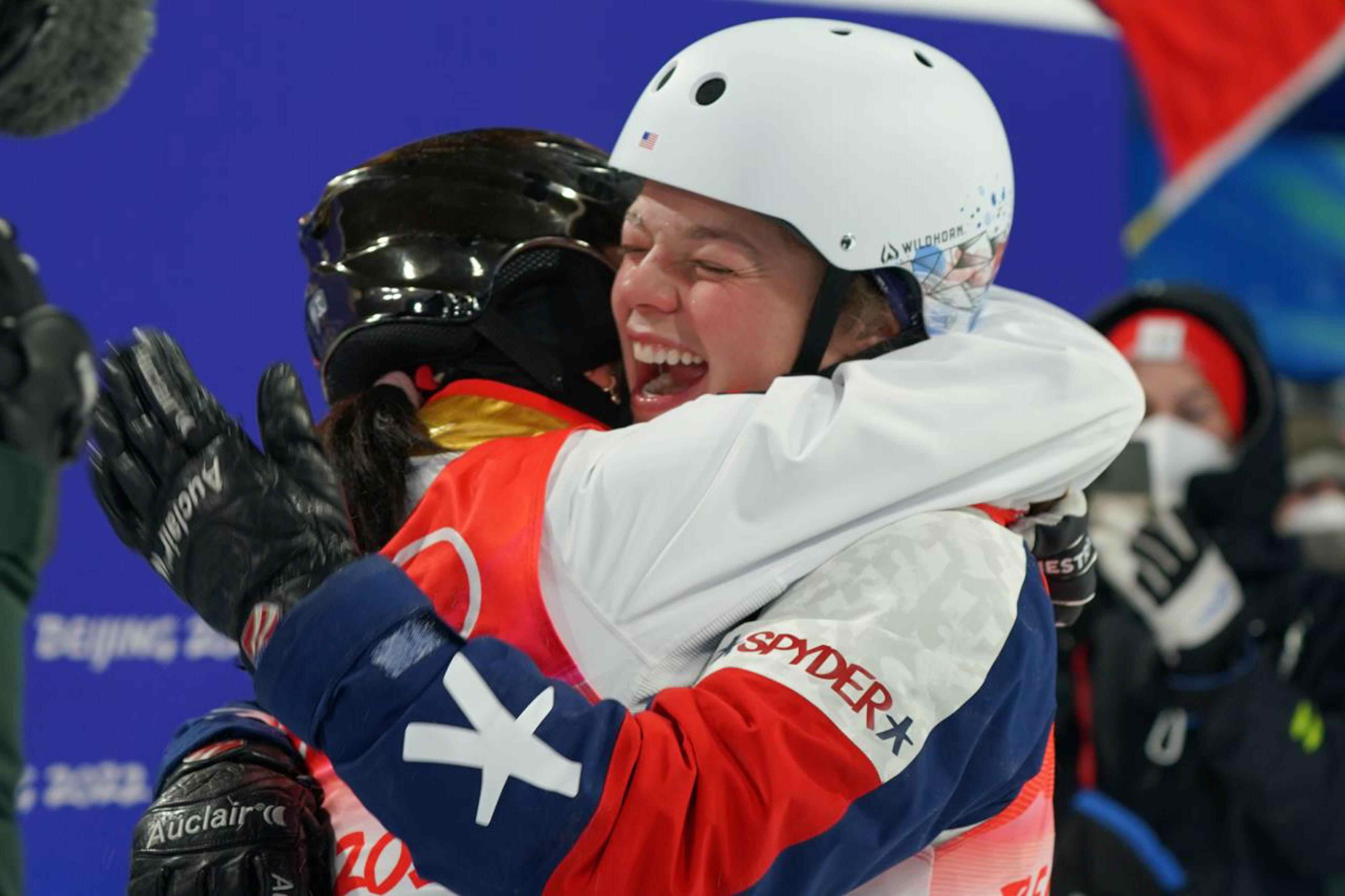 中国选手徐梦桃夺冠后,美国选手阿什利·考德威尔给了她一个大大的拥抱。(资料图)